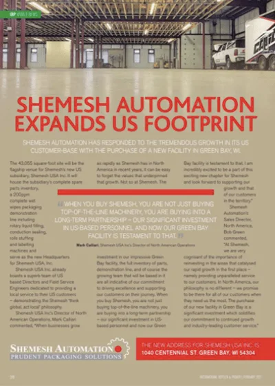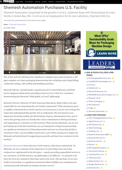 PACKAGING WORLD (PMMI): Shemesh Purchases New US Facility