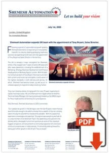 Following a period of unprecedented growth globally, Shemesh Automation is responding to increased demand for its industry-leading packaging machinery solutions by expanding its UK team with the appointment of Tony Bryant as Sales Director in the territory.