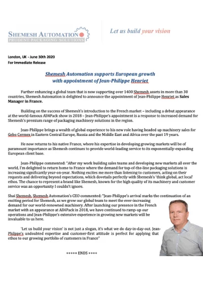 G - Shemesh Expands Across Europe with the Appointment of Jean-Philippe Henriet