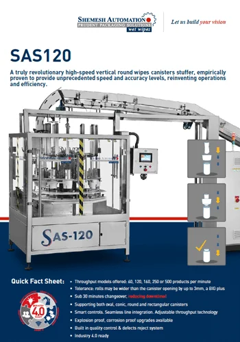 Available both as a standalone unit, or as part of our complete turn-key wipes packaging lines, the SAS120 is engineered so that the diameter of each wipes role may be larger than the canister opening by up to 10mm – a big plus!