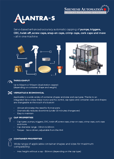 From cleaning products with trigger nozzles to cosmetics products with air pumps, Shemesh Automation’s ALANTRA is designed to provide accurate, efficient torque-measured capping for a wide variety of industries.