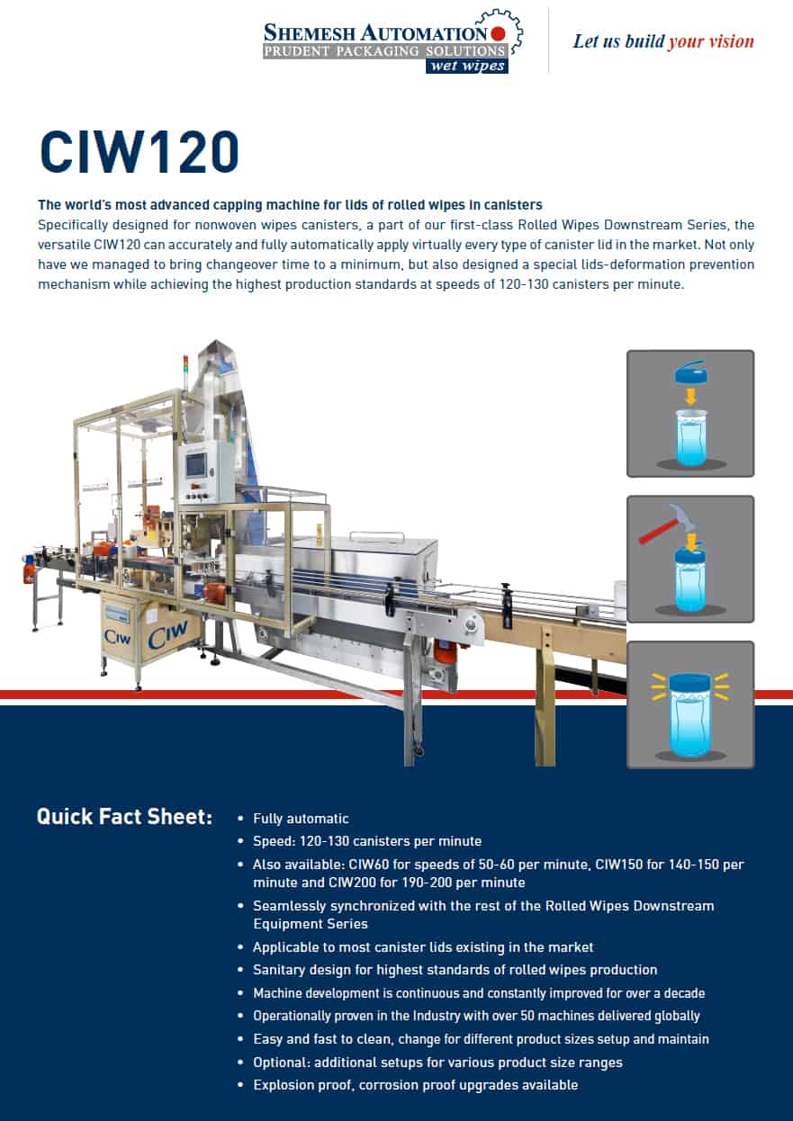 The CIW120 Automatic Capping Machine contains a Shemesh Automation proprietary-design anti-deformation system which stops caps from becoming deformed during the capping process. This industry leading innovation provides yet more efficiency to your canister packaging process, reducing waste and downtime.