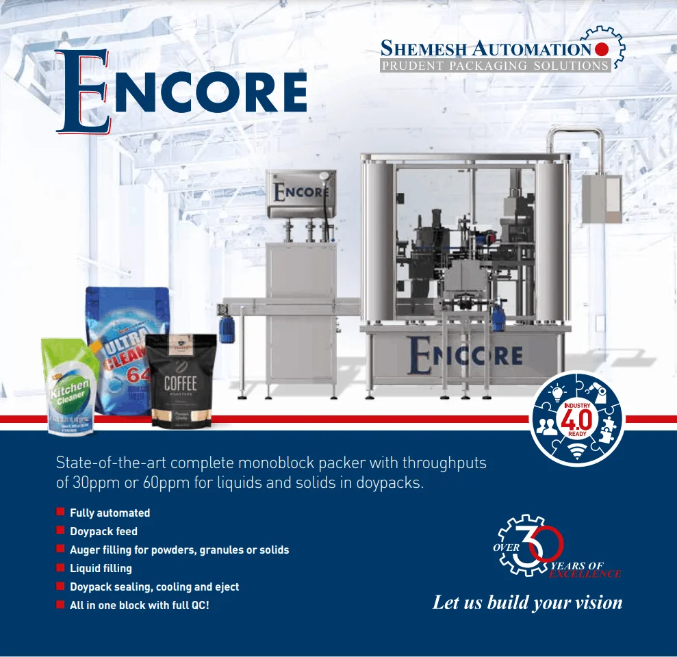 SA’s unique Encore monoblock has a filling range of 50ml to 5L and operates at speeds of up to 30ppm/60ppm (regular size), 12-15 (jumbo size)