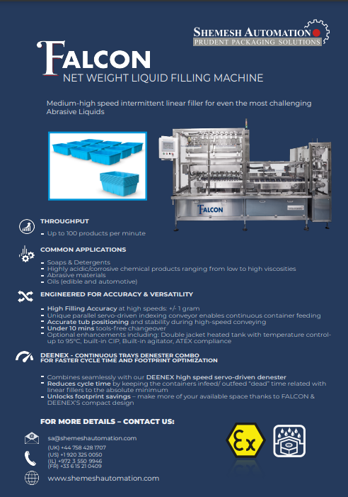 The “Falcon” Net weight liquid filler is a state-of-the-art, medium- high speed intermittent linear filler design, engineered to accommodate the most challenging and abrasive liquids, with high accuracy filling capabilities for a variety of products from low to high viscosity.