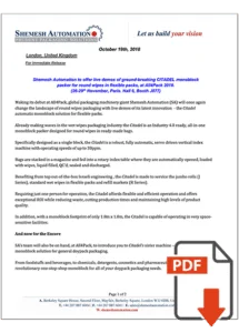 With over 30 years in the industry, Shemesh Automation is a global leader in the high-end packaging and assembly machinery and industrial automation appliances manufacturing arena. The family-owned business supports almost 2,000 assets in over 30 countries around the world. Its nonwovens arm, Shemesh Automation Wet Wipes (www.sawetwipes.com) is a global pioneer in nonwovens downstream packaging equipment with cutting-edge technology positioned at the very forefront of the industry.