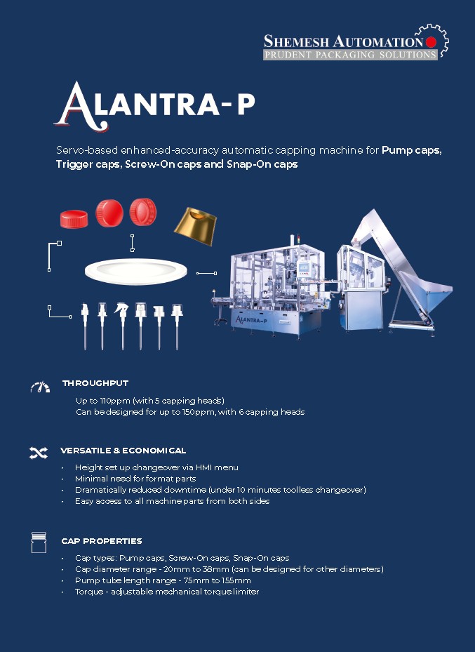 From cleaning products with trigger nozzles to cosmetics products with air pumps, Shemesh Automation’s ALANTRA is designed to provide accurate, efficient torque-measured capping for a wide variety of industries.